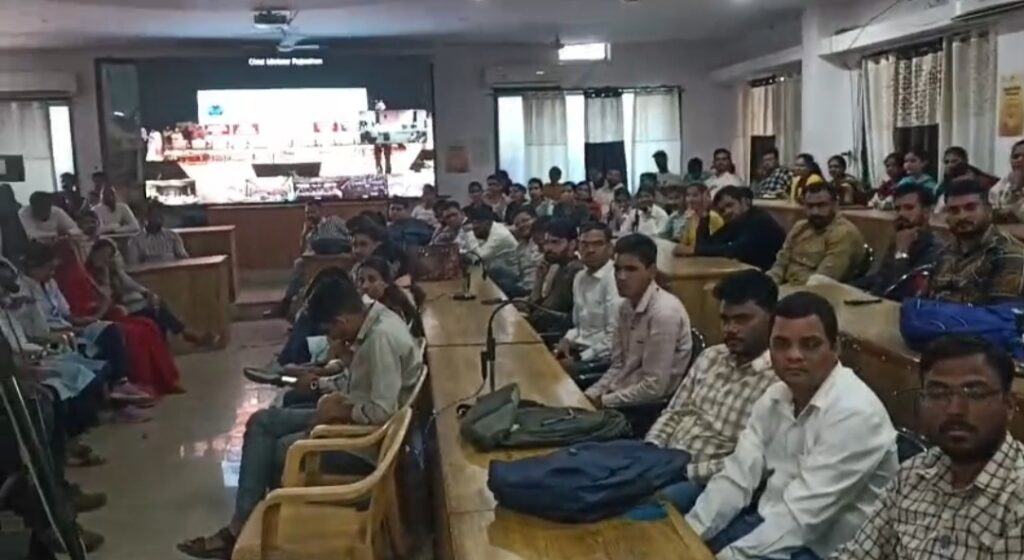 राजसमन्द। 17 मार्च। राजस्थान युवा शक्ति दिवस 2026 के मौके पर राजसमंद जिला परिषद सभागार में जिलास्तरीय रोजगार उत्सव का आयोजन किया गया। कार्यक्रम में अतिरिक्त जिला कलेक्टर नरेश बुनकर एसडीएम बृजेश गुप्ता सहित जिला स्तरीय अधिकारी भी मौजूद रहे। इस मौके पर एक बड़ी स्क्रीन पर मुख्यमंत्री भजनलाल शर्मा के कार्यक्रम का लाइव प्रसारण भी दिखाया गया। कार्यक्रम में करीब 150 लोगों की बैठक व्यवस्था की गई थी जबकि 225 युवा पहुंचने से आयोजन स्थल पर व्यवस्थाएं हो गई। दर्जनों युवा कार्यक्रम के दौरान खड़े नजर आए। मुख्यमंत्री जी का अभी भाषण सुनने के बाद जिले में नवनियुक्त कर्मचारियों को नियुक्ति पत्र भी सौपे गए।