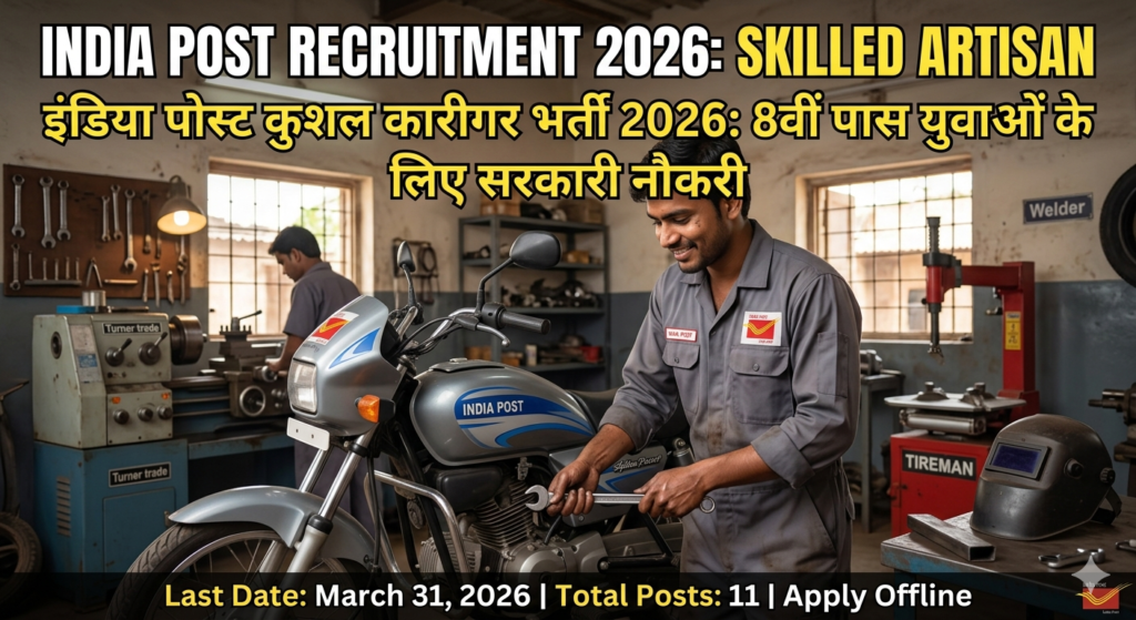 भारतीय डाक विभाग ने सरकारी नौकरी की तलाश कर रहे युवाओं के लिए एक सुनहरा अवसर प्रदान किया है। इंडिया पोस्ट ने कुशल कारीगर (Skilled Artisan) के विभिन्न पदों पर भर्ती के लिए आधिकारिक नोटिफिकेशन जारी कर दिया है। इस भर्ती अभियान के माध्यम से कुल 11 रिक्त पदों को भरा जाएगा। इस भर्ती की सबसे विशेष बात यह है कि इसके लिए न्यूनतम शैक्षणिक योग्यता मात्र 8वीं पास रखी गई है, जिससे बड़ी संख्या में युवा इस अवसर का लाभ उठा सकते हैं। विभाग ने इस भर्ती के लिए आवेदन प्रक्रिया को पूरी तरह से ऑफलाइन रखा है, जो 20 फरवरी 2026 से शुरू हो चुकी है और इच्छुक अभ्यर्थी 31 मार्च 2026 तक अपना आवेदन भेज सकते हैं।