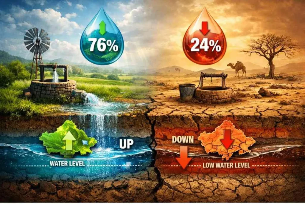जयपुर: रेगिस्तानी राज्य राजस्थान से जल संरक्षण के मोर्चे पर एक उत्साहजनक खबर सामने आई है। केंद्रीय भू-जल बोर्ड (CGWB) की ताजा रिपोर्ट के अनुसार, पिछले एक वर्ष में प्रदेश के 76 प्रतिशत क्षेत्रों के भू-जल स्तर में सुधार दर्ज किया गया है। हालांकि, चिंता की बात यह है कि अभी भी करीब 24 प्रतिशत इलाकों में पानी का स्तर नीचे खिसका है।